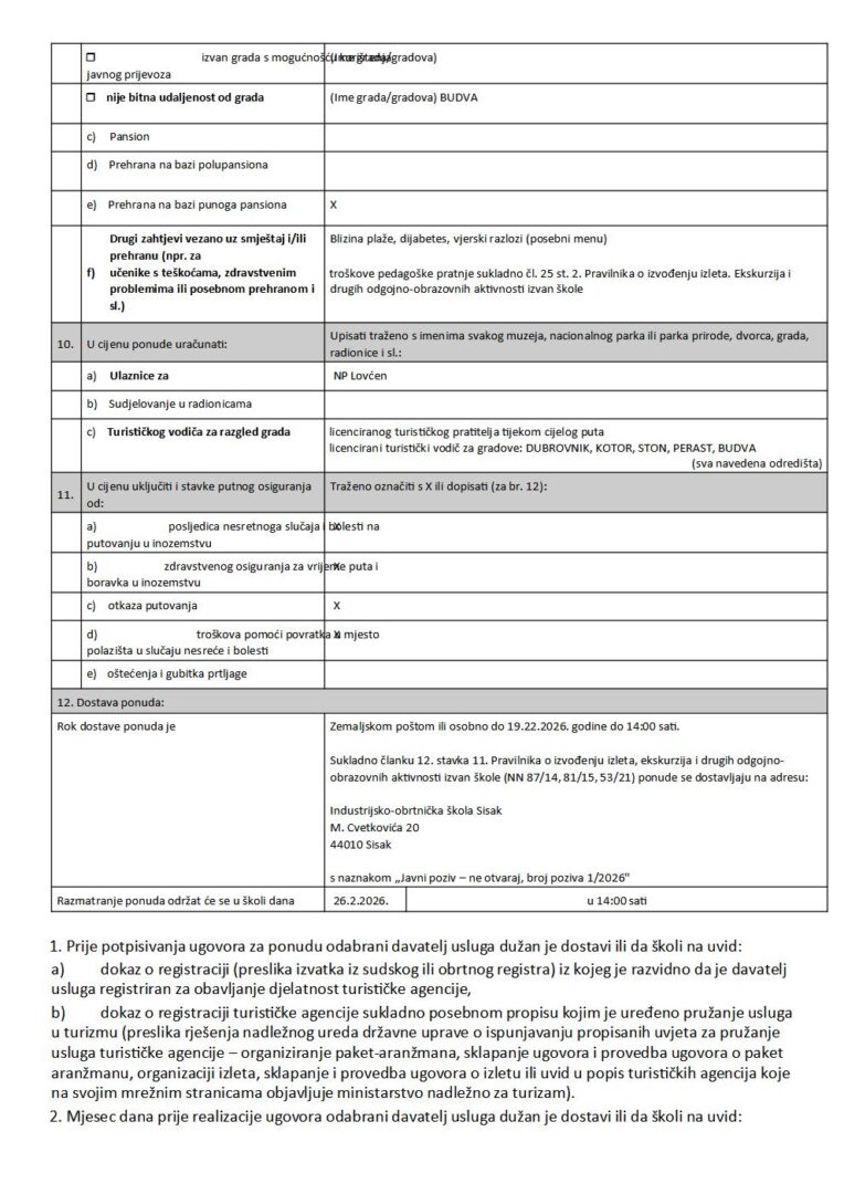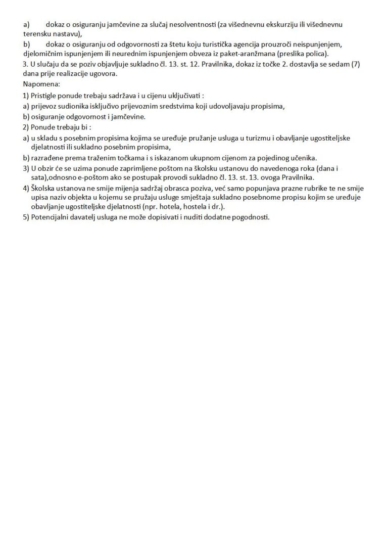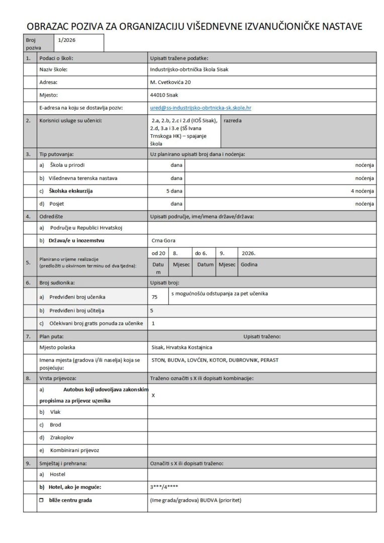 OBRAZAC POZIVA ZA ORGANIZACIJU VIŠEDNEVNE IZVANUČIONIČKE NASTAVE